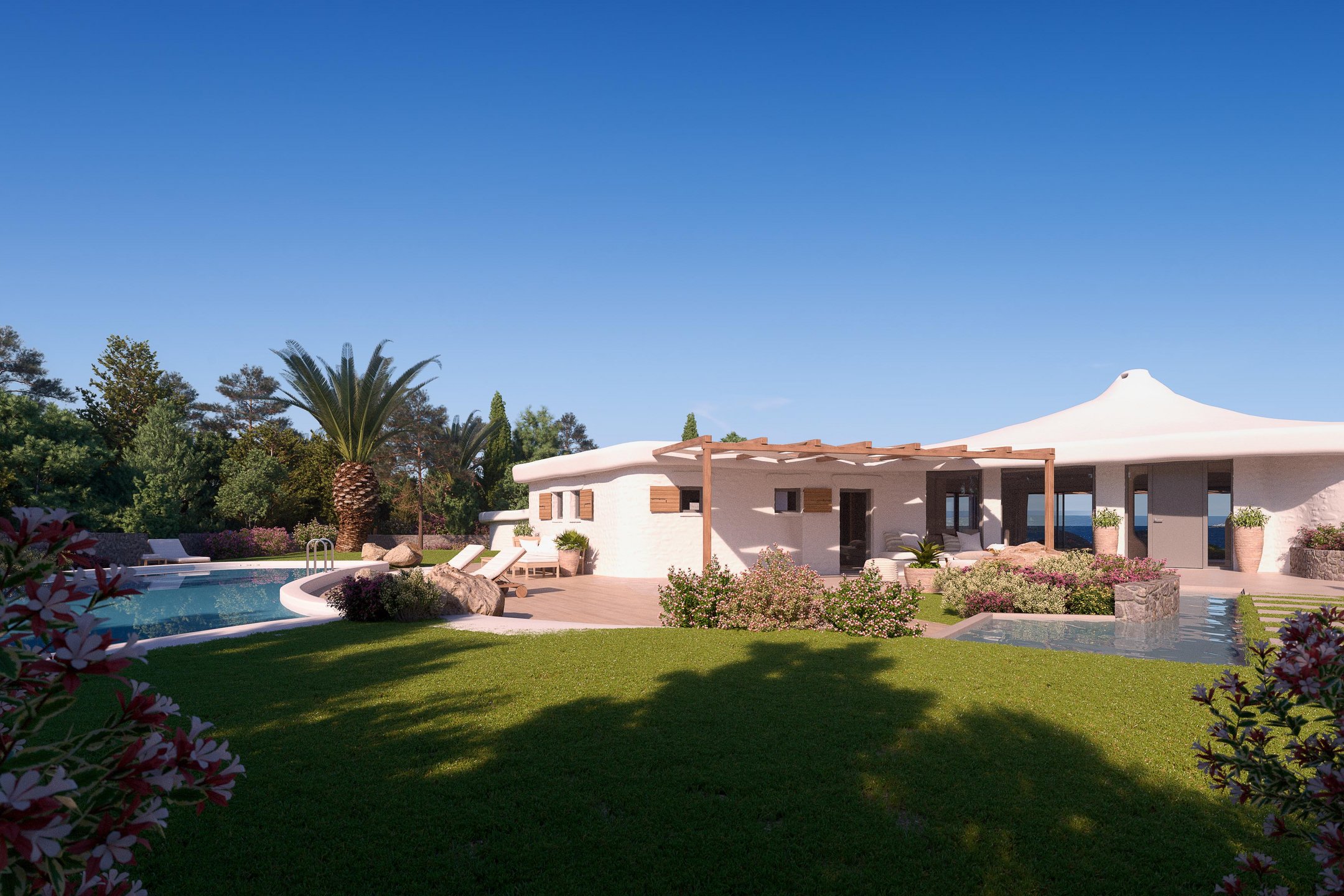 Hochwertige 3D‑Renderings haben nicht nur die architektonische Formensprache der Villa, sondern auch das mediterrane Ambiente des Grundstücks eindrucksvoll hervorgehoben. Der Charakter Sardiniens wird durch sanfte organische Formen, Naturstein und weiße Putzflächen widergespiegelt. Pool, Terrasse und Außenbereiche wurden bis ins Detail visualisiert, sodass Betrachter*innen förmlich in die Szene eintauchen.