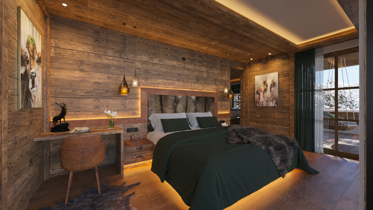 Traditional materials such as reclaimed wood, natural stone, and iron are combined in the chalet with a clear design language and modern furnishings. The 3D renderings illustrate the architectural quality and emotional depth of the project, both in daylight and in atmospheric evening settings.