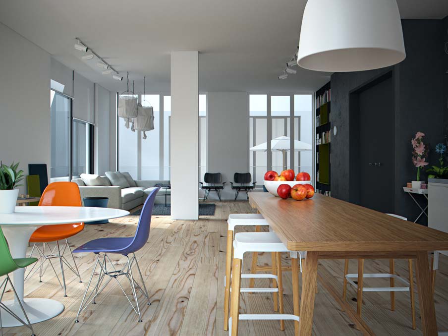 Die Küche, heute ein zentraler und kommunikativer Raum in einem modernen Appartement, ist z.B. mit schlichten, weißen Fronten und farbig bunten Kunststoffstühlen ausgestattet. Originell von gmsvision: Eine Wand der Küche besteht komplett aus einer grauen Schiefertafel, die die Bewohner für Notizen und Nachrichten, aller Art und für jedermann lesbar nutzen können. Auch das Wohnzimmer, ein Raum für die Privatsphäre und für Gäste ist lediglich mit einer schlichten, weißen Sitzlandschaft, rohen Holzdielen und im puristischen Bücherregal versteckten kleinen Flachbildschirm ausgestattet. gmsvision hat bei seinem visualisierten Konzept hervorragend eingeplant, dass gerade die Käufer von Luxuswohnungen, wie sie das LUX bietet, vielfach Kunst- und Design Interessierte sind, die großen Wert auf Ästhetik legen und ansprechende Plätze für ihre Sammlungen und ihre Möbel bevorzugen, um diese optimal in Szene setzen zu können.
