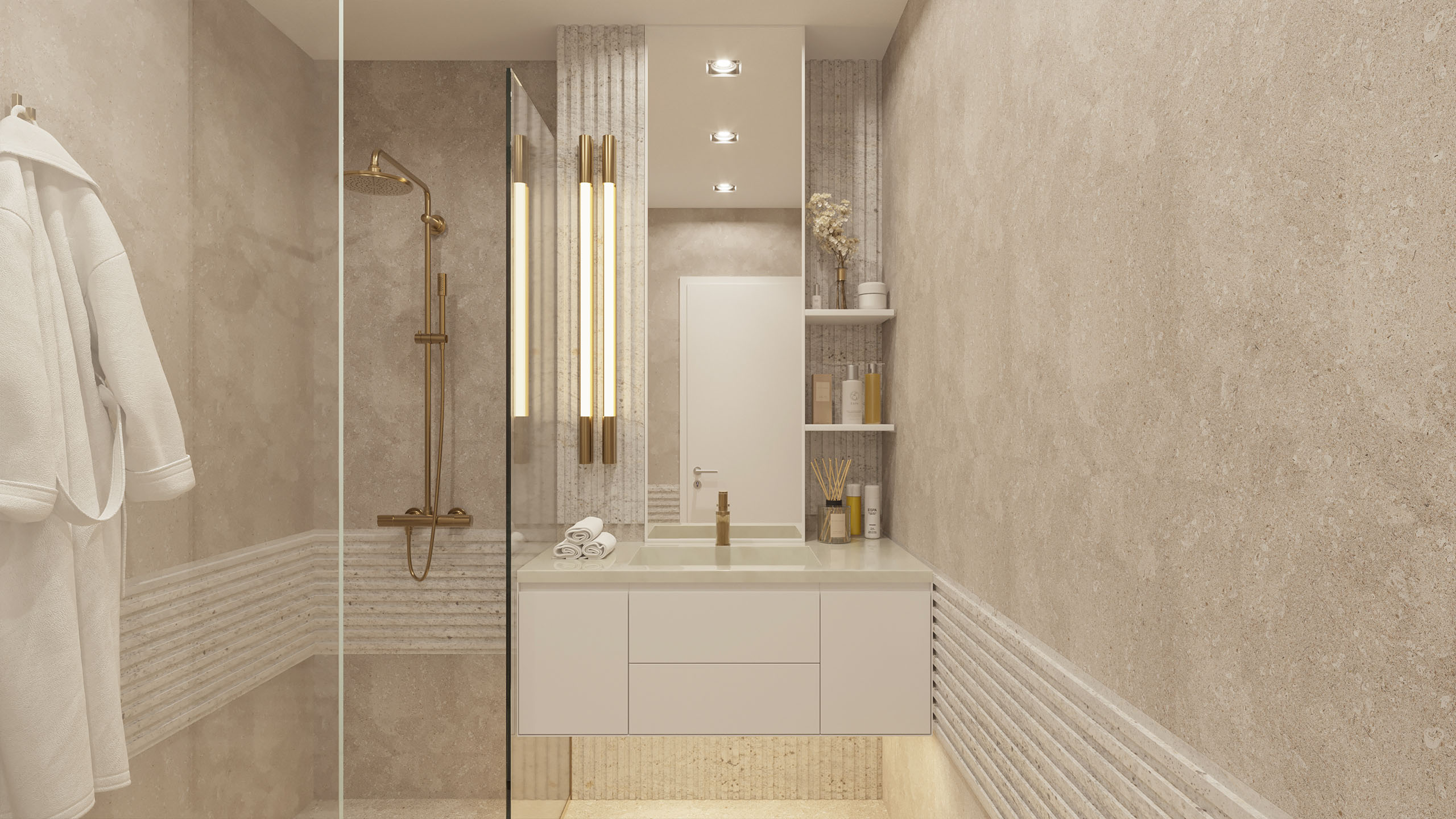 Auch das Badezimmer wurde mit besonderem Augenmerk visualisiert. Klare Linien, strukturierter Naturstein und hochwertige Armaturen verleihen dem Raum einen eleganten und modernen Charakter.