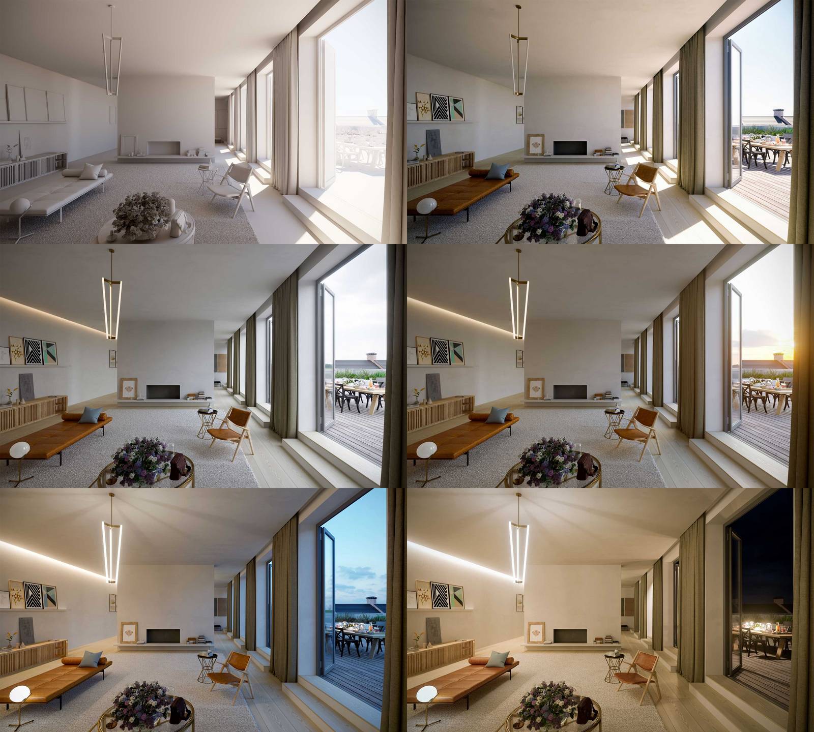 Das Penthouse wurde in verschiedenen Lichtstimmungen visualisiert – vom hellen Morgenlicht über warme Abendstimmungen bis hin zur nächtlichen Beleuchtung.